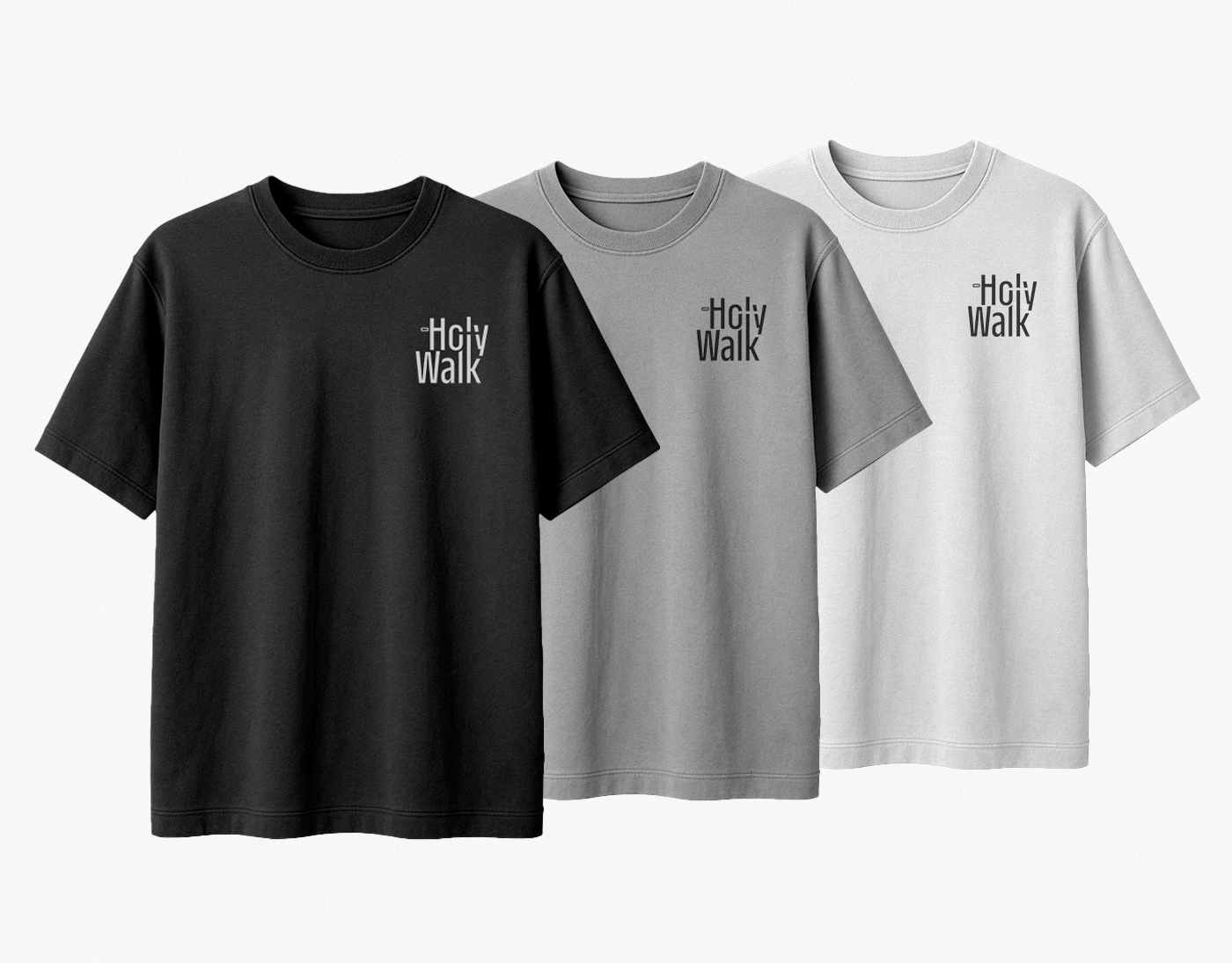 Aplicações do logo Holy Walk em diferentes bases neutras — preto, cinza e branco — garantindo versatilidade, contraste e legibilidade em qualquer proposta de cor.